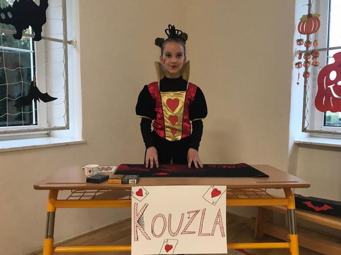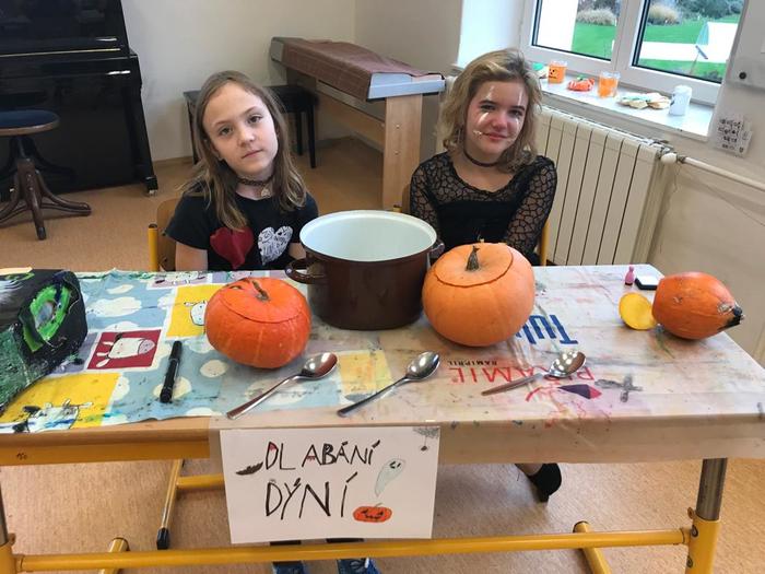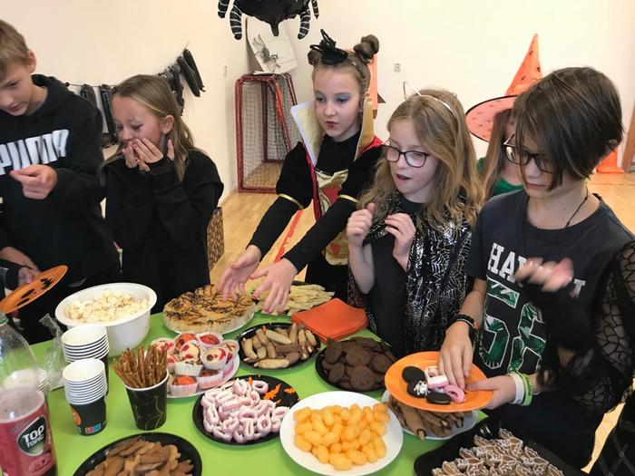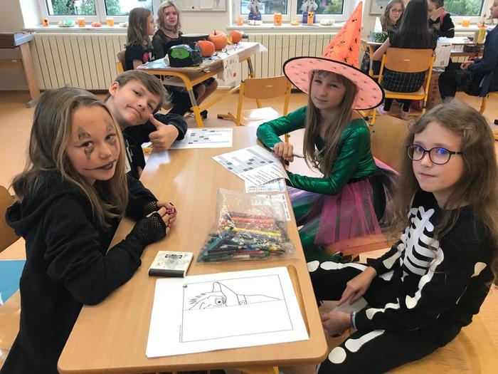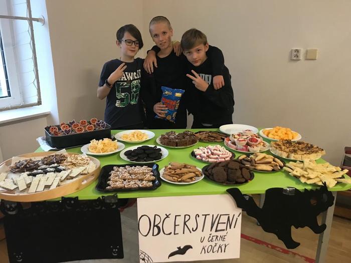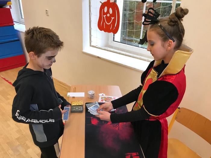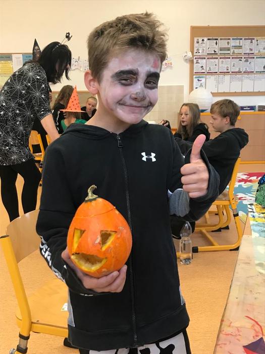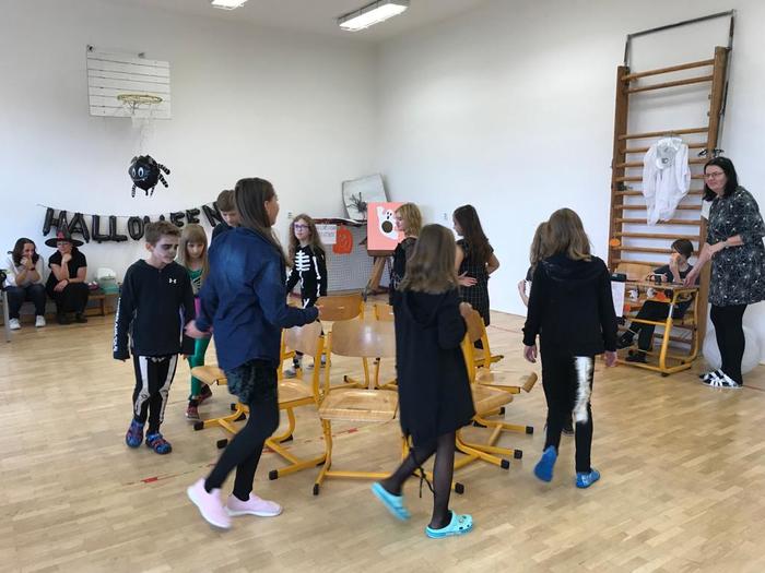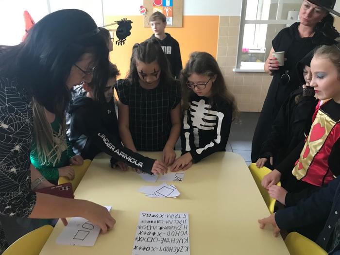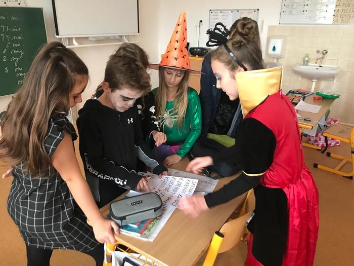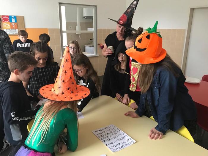 Halloween již neodmyslitelně patří k tradičním akcím, které naše škola v Dobroslavicích pořádá. Letošní páťáci si připravili pro čtvrtou třídu bohatý program, který se odehrával v průběhu dopoledne v celé škole. Prvním úkolem pro čtvrťáky bylo pomocí šifry najít ztracené spolužáky. Byli moc šikovní a všechny páťáky našli :-) Získali tak další indicii, díky které rozluštili, kde bude halloweenský program pokračovat. Následovalo plnění úkolů na jednotlivých stanovištích: dlabání dýně, únikovka, luštění křížovky a tvoření z papíru. V tělocvičně na nás čekalo výborné občerstvení U Černé kočky a náš program tak pokračoval dál. Děti si tady mohly vyzkoušet záhadné pokusy, hádaly, co je ukryto v kouzelné krabici, Srdcová dáma jim předvedla kouzla. Na dalším stanovišti si žáci otestovali svou obratnost. Na konci této akce nechybělo ani vyhodnocení soutěže o nejlepší kostým a obrázek s halloweenskou tématikou. Všem dětem, které akci připravovaly patří velká pochvala. Zároveň bychom chtěli poděkovat rodičům za přípravu pestrého a velmi dobrého občerstvení.