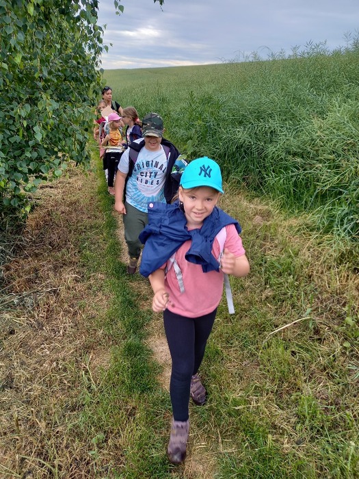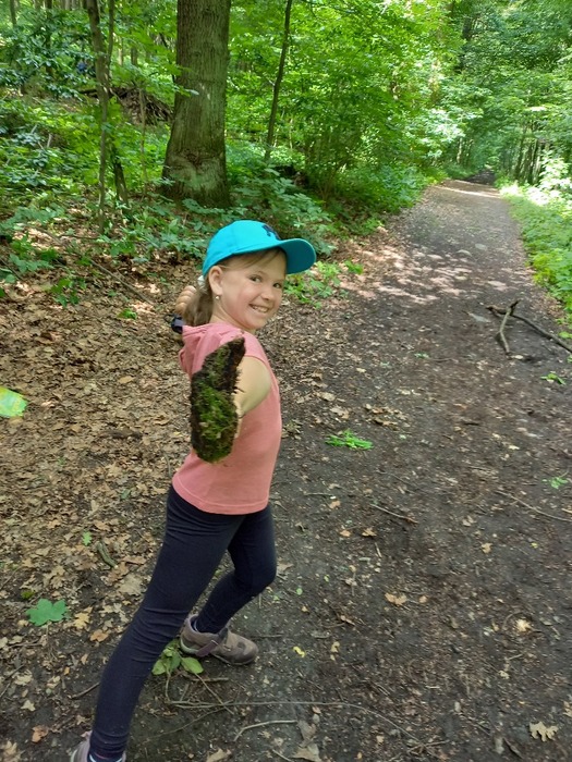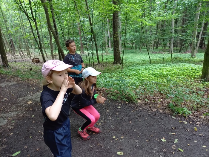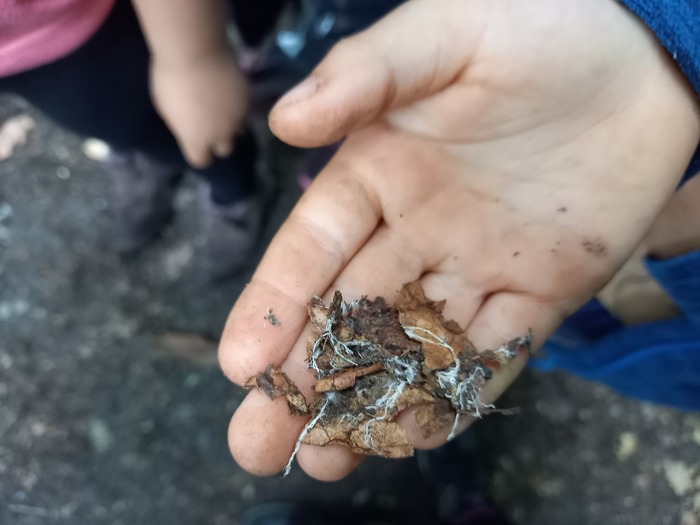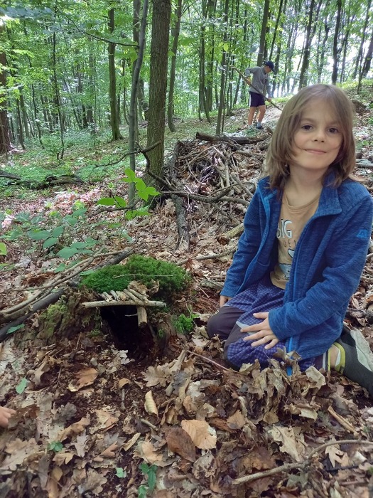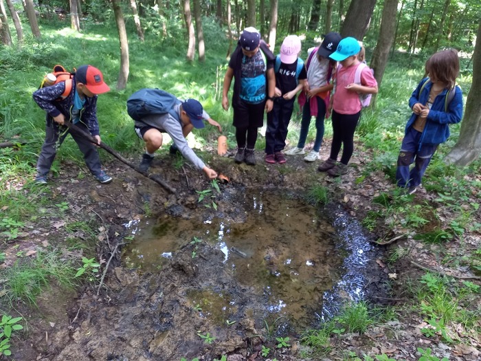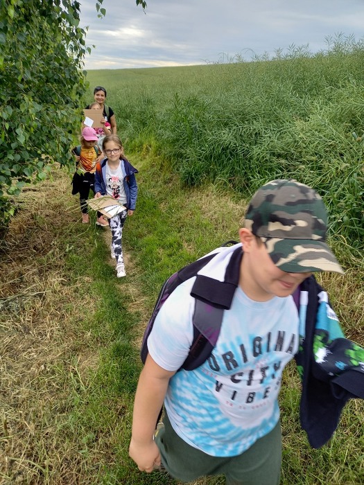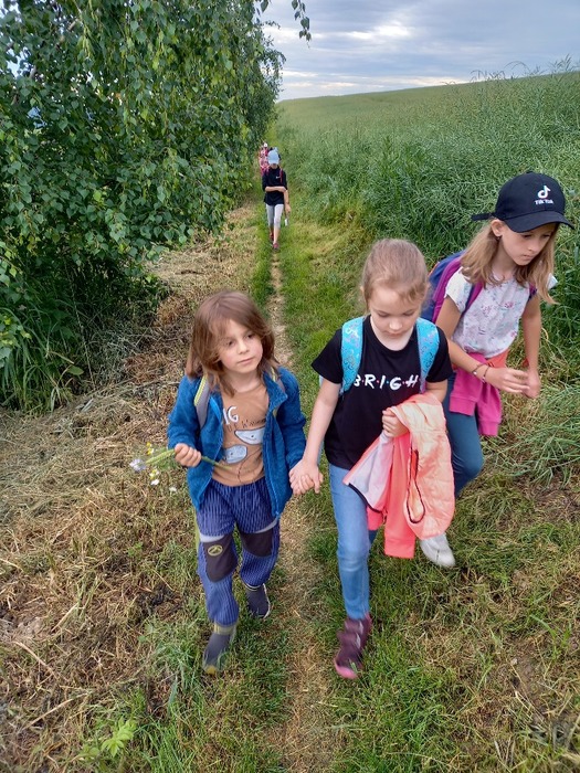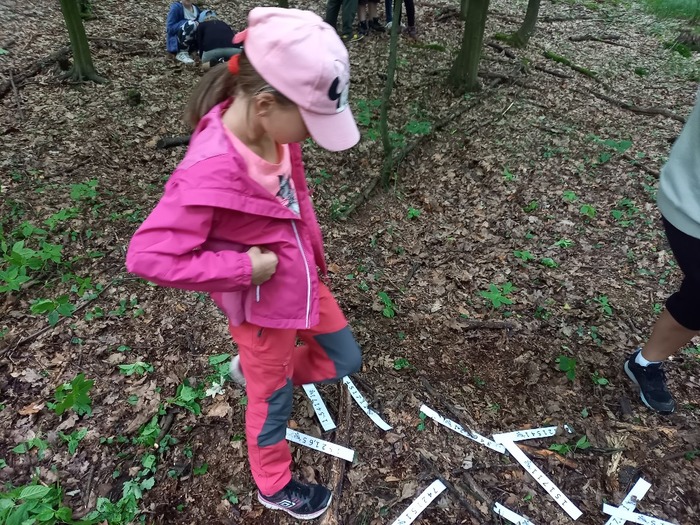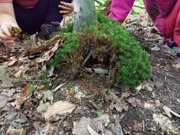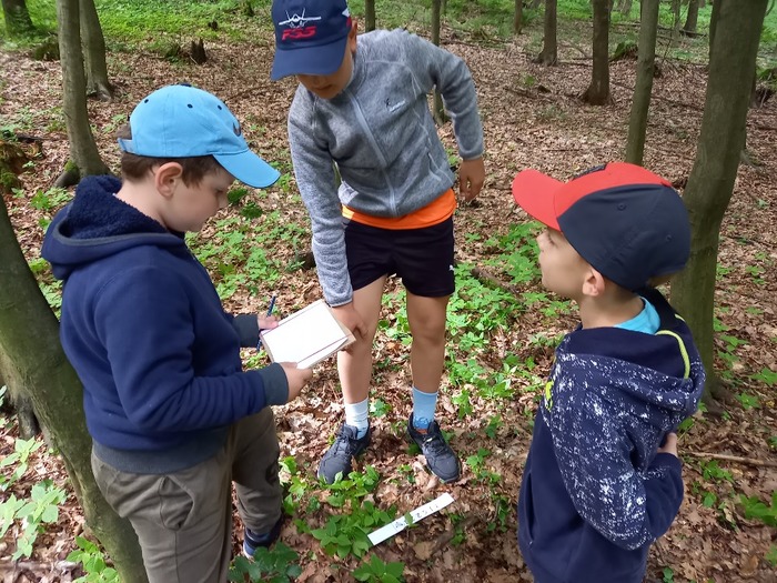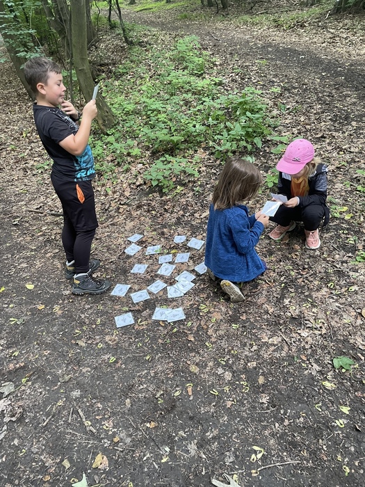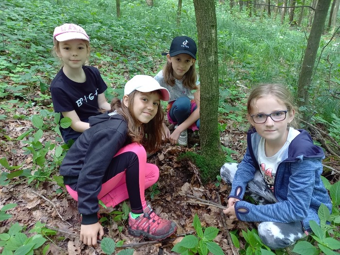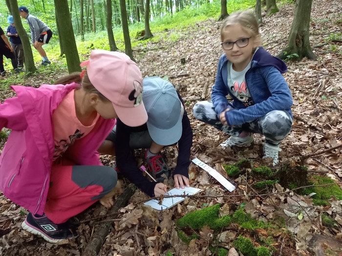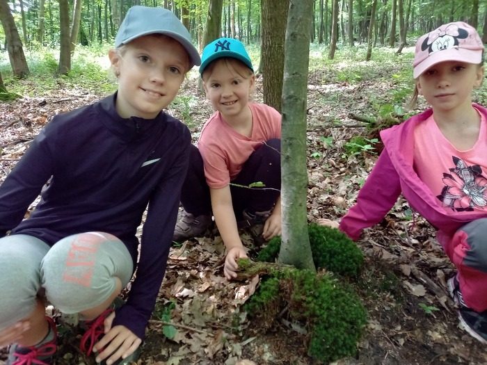 Z našich toulek krajinou už ledacos víme o stromech i rostlinách, které najdeme v lese. Co nás překvapilo, bylo zjištění, že i v lese mají internet a představte si, že se za něj dokonce i platí. Čím? Cukrem. A kdo ho využívá? Stromy. A k čemu? Aby byly v bezpečí před škůdci a jinými hrozbami. Lesní internet se nám pod nánosy listí nakonec podařilo najít. Zopakovali jsme si vše, co už o lese a životě v tomto ekosystému víme. Děti skládaly věty o lesních živočiších, hledaly základní skladební dvojice a doplňovaly slovní druhy. Vše v pohybu a s radostí plnily, ani si nevšimly, že se stále učí. Cestou jsme zkontrolovali naši tůňku a našli v ní spoustu malých pulců. Nakonec jsme se pokusili postavit domečky pro malé broučky nebo lesní skřítky. Snad se jim v mechových příbytcích bude krásně bydlet.