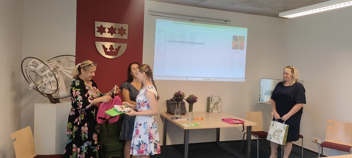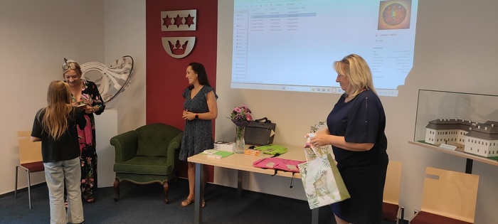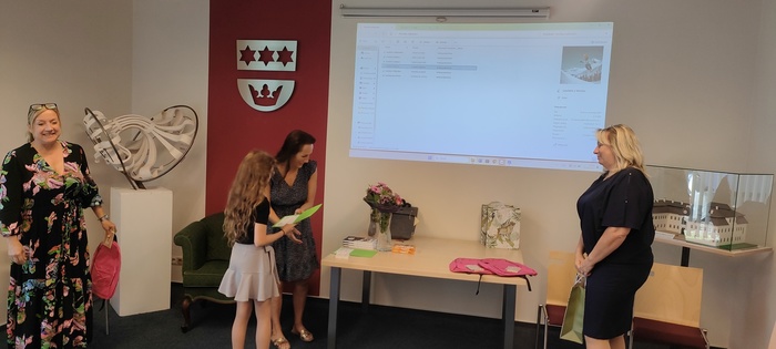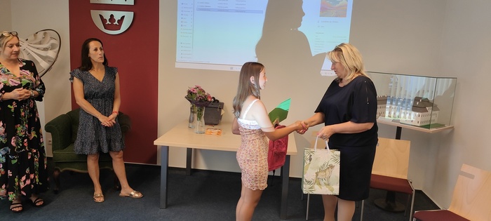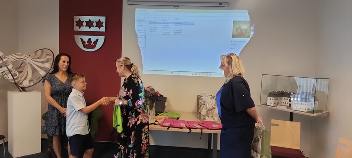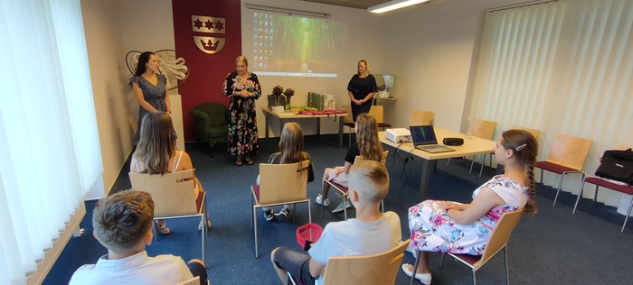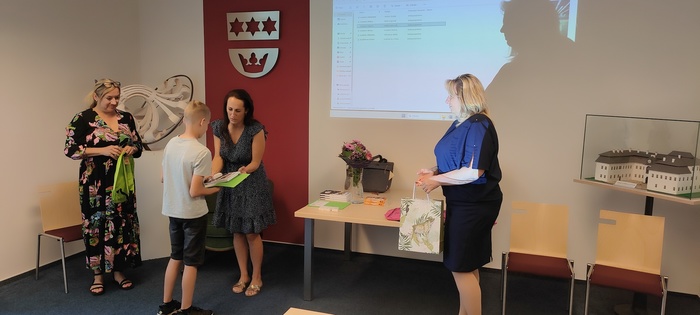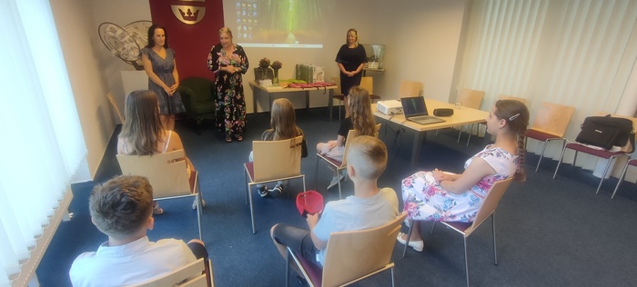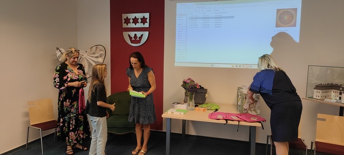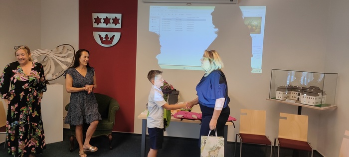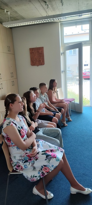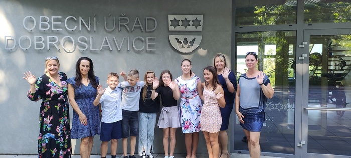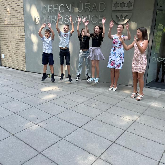 Dopolední část slavnosti proběhla na obecním úřadě v Dobroslavicích. Děti zde přivítala paní ředitelka spolu se starostkami obcí Děhylov a Dobroslavice. Všechny tři dámy popřály páťákům mnoho úspěchů v dalším vzdělávání a věnovaly jim krásné dárky na památku. Následovala emotivní projekce fotografií, které připomněly společné okamžiky od 1. až po 5. třídu.